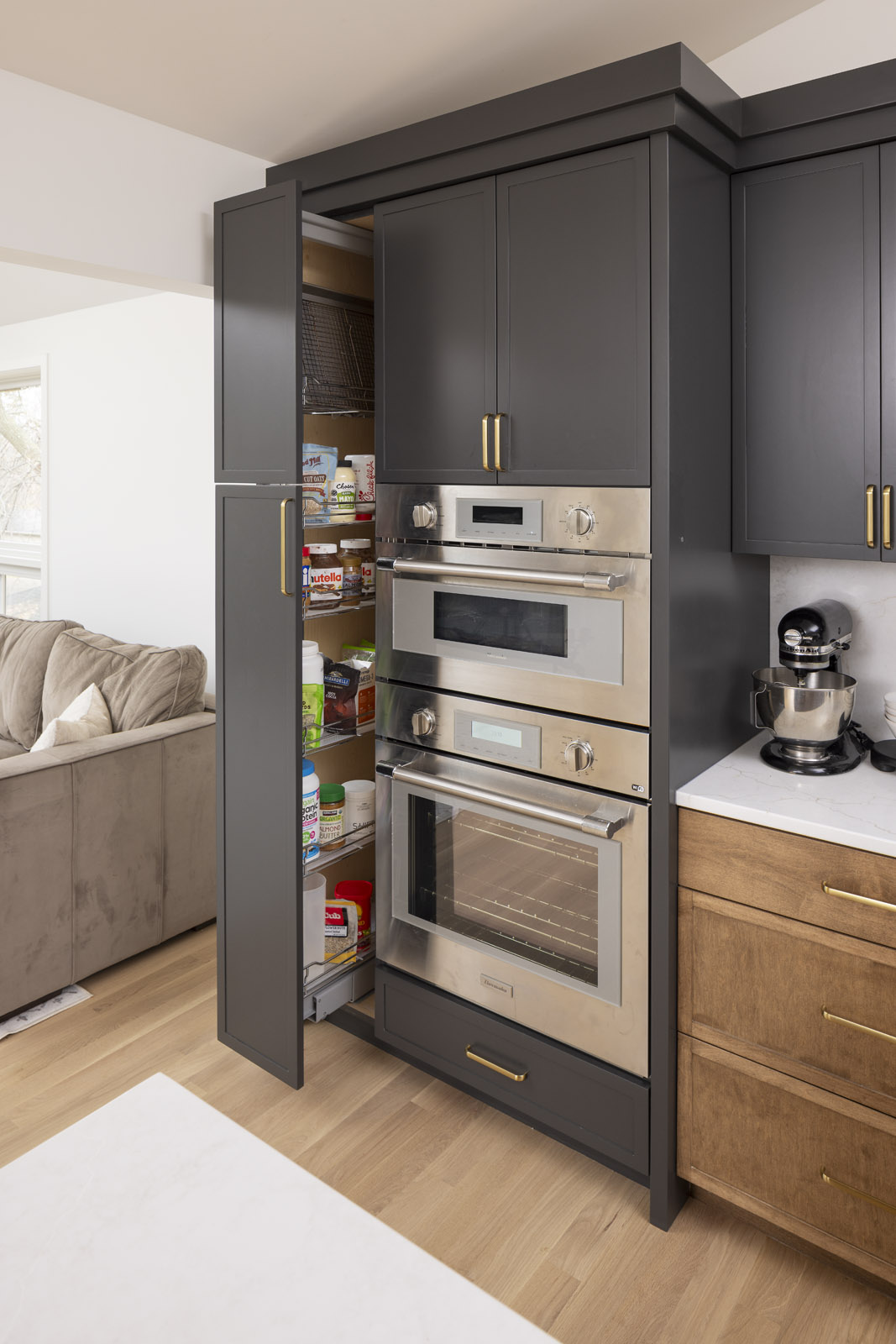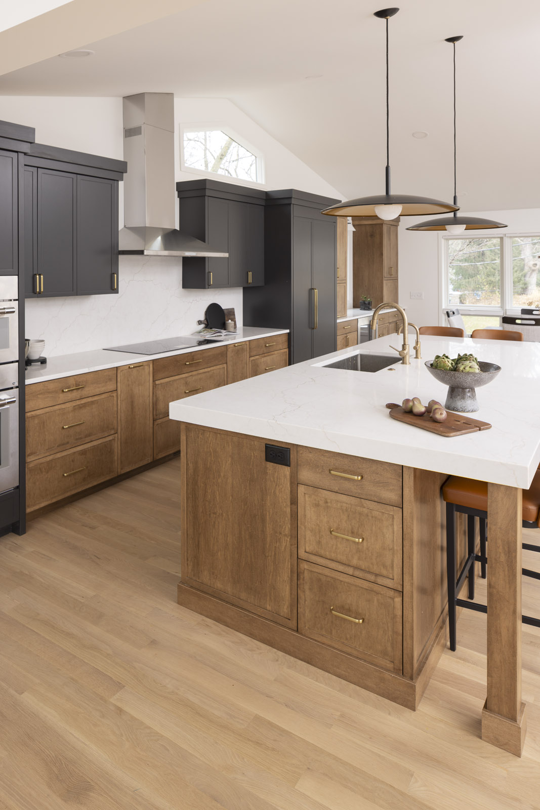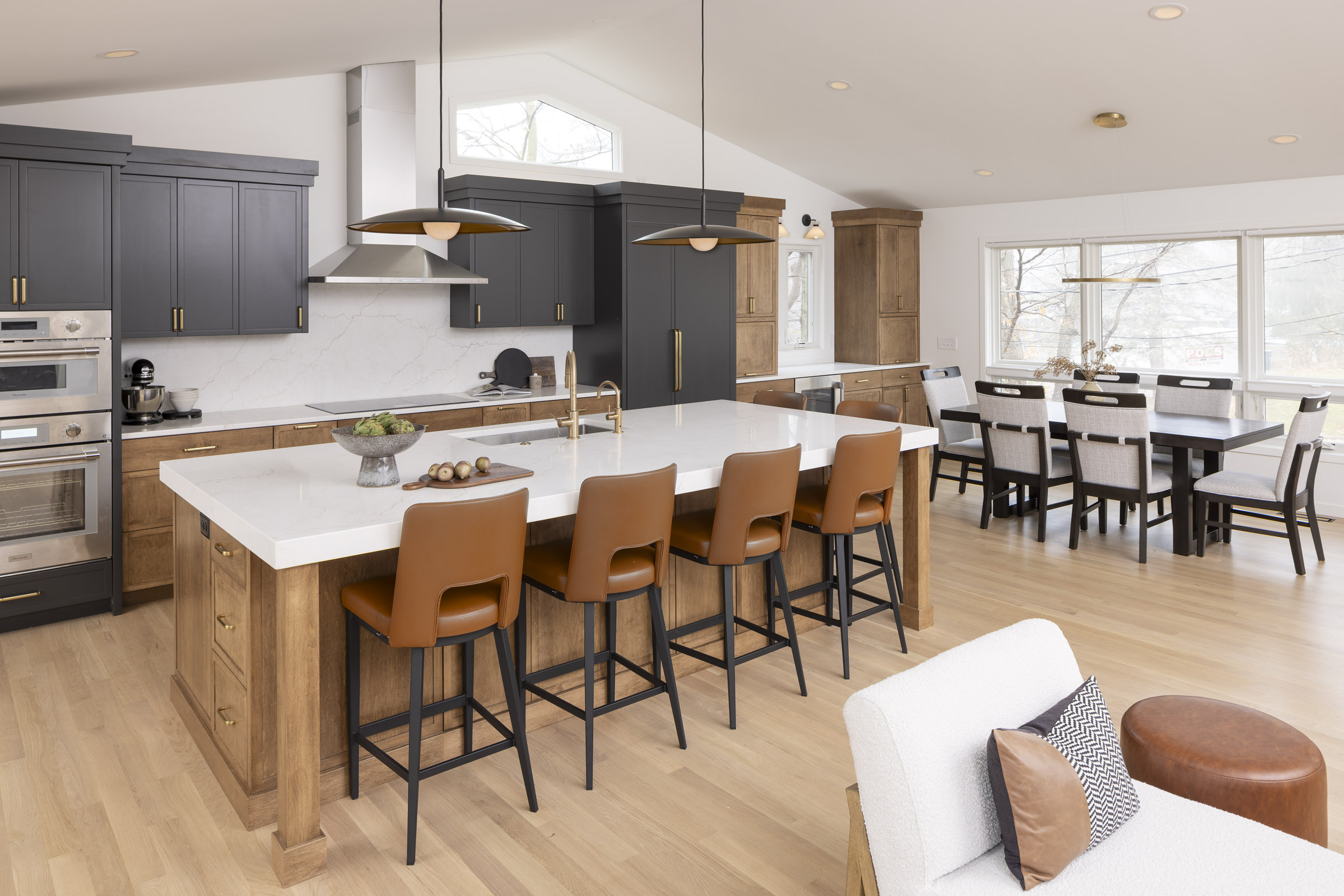 Taking down walls surrounding the kitchen and raising the sunken living room opened up options for a reimagined and cohesive floor plan. The new open kitchen with rich grey cabinetry and brass accents is centrally positioned to easily cater to dining guests or snacking kids in the family room. Organizational built-ins like a charging drawer, aerated fresh produce drawers, pull-out pantry, and hidden office zone create thoughtful daily living.