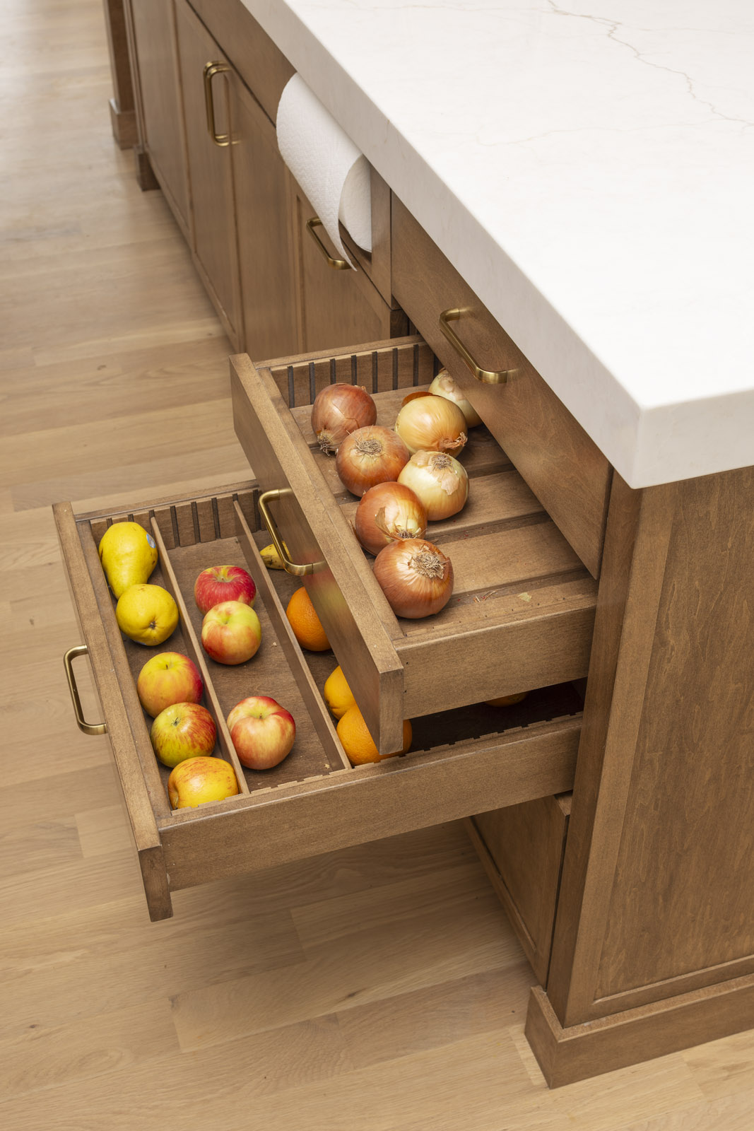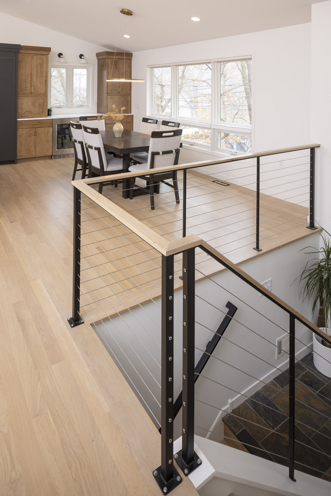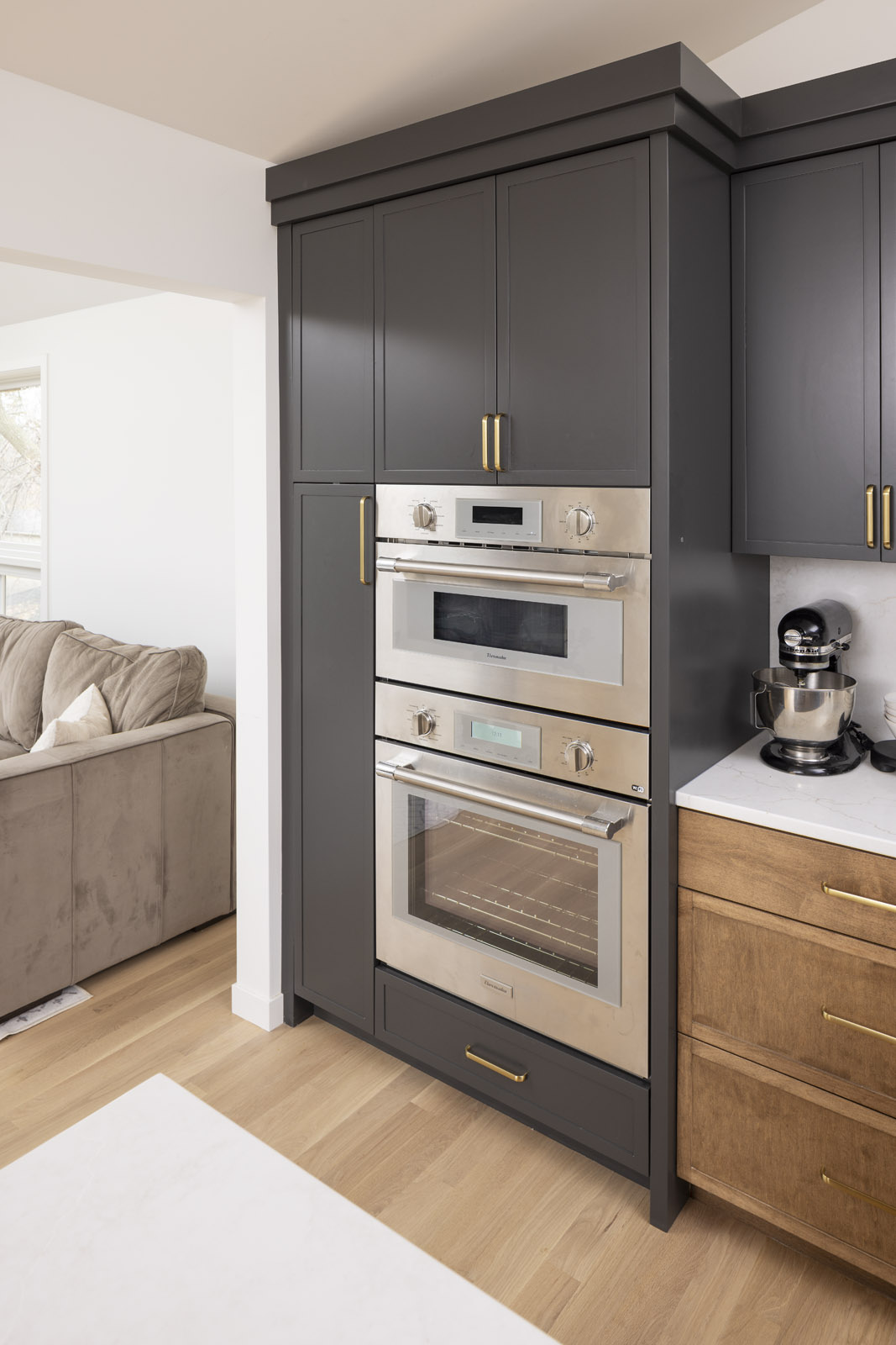 Taking down walls surrounding the kitchen and raising the sunken living room opened up options for a reimagined and cohesive floor plan. The new open kitchen with rich grey cabinetry and brass accents is centrally positioned to easily cater to dining guests or snacking kids in the family room. Organizational built-ins like a charging drawer, aerated fresh produce drawers, pull-out pantry, and hidden office zone create thoughtful daily living.