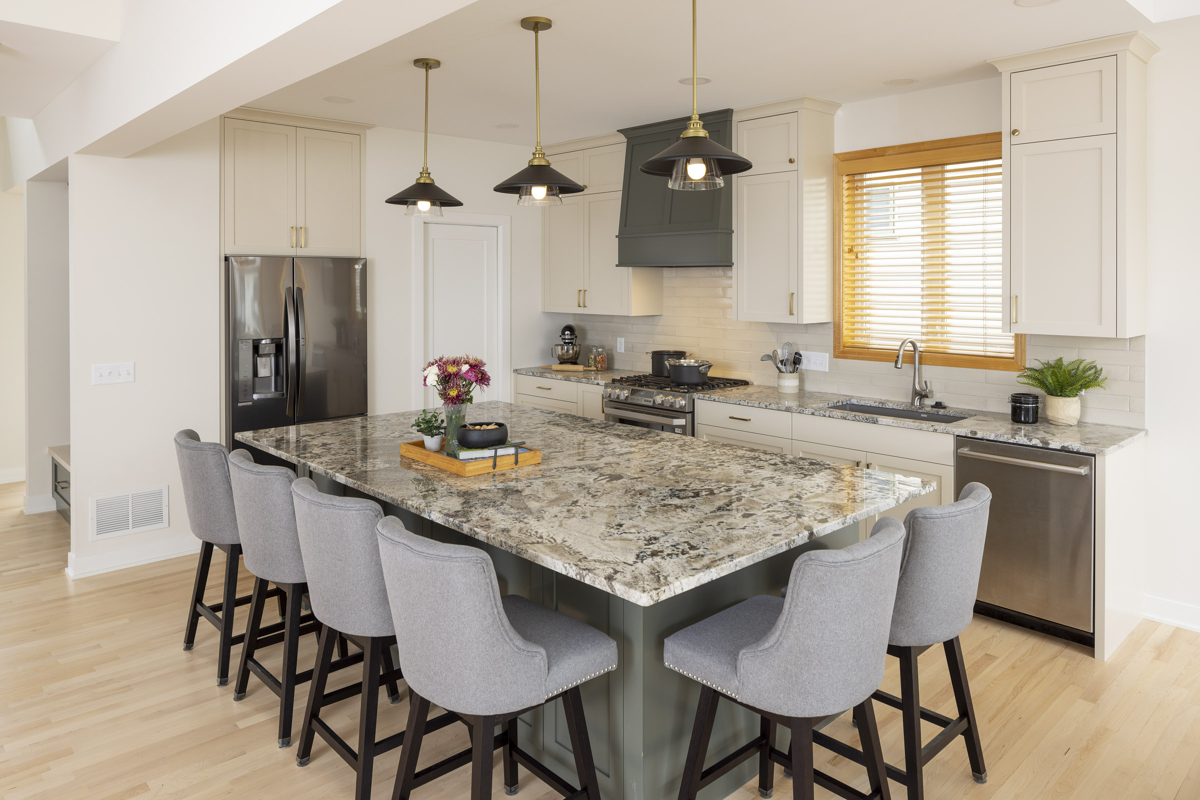 Removing a wall to open up the main level and adding island seating makes sure the grandparents don’t miss out on any of the fun. The finished lower level cues up overnight stays and movie marathons plus in-home workouts.