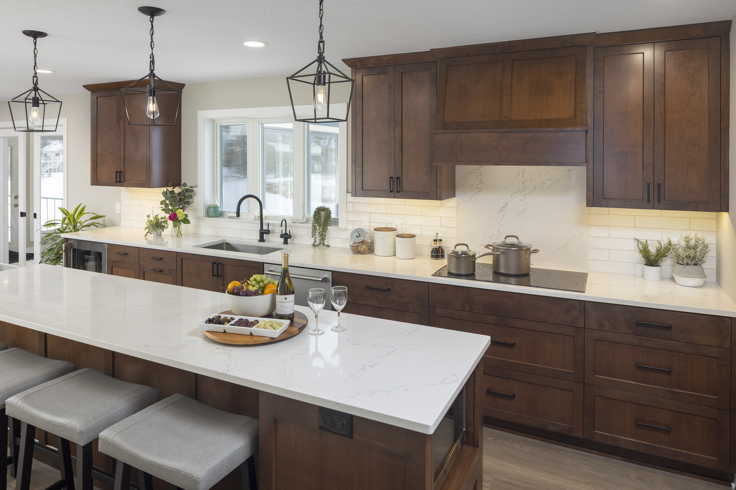 It’s like a new home after a main level remodel that intertwines function and warm ambiance for our Vadnais Heights family. Kitchen boasts a pantry, island with seating, and double ovens. The porch overlooks the backyard pond and play area.
