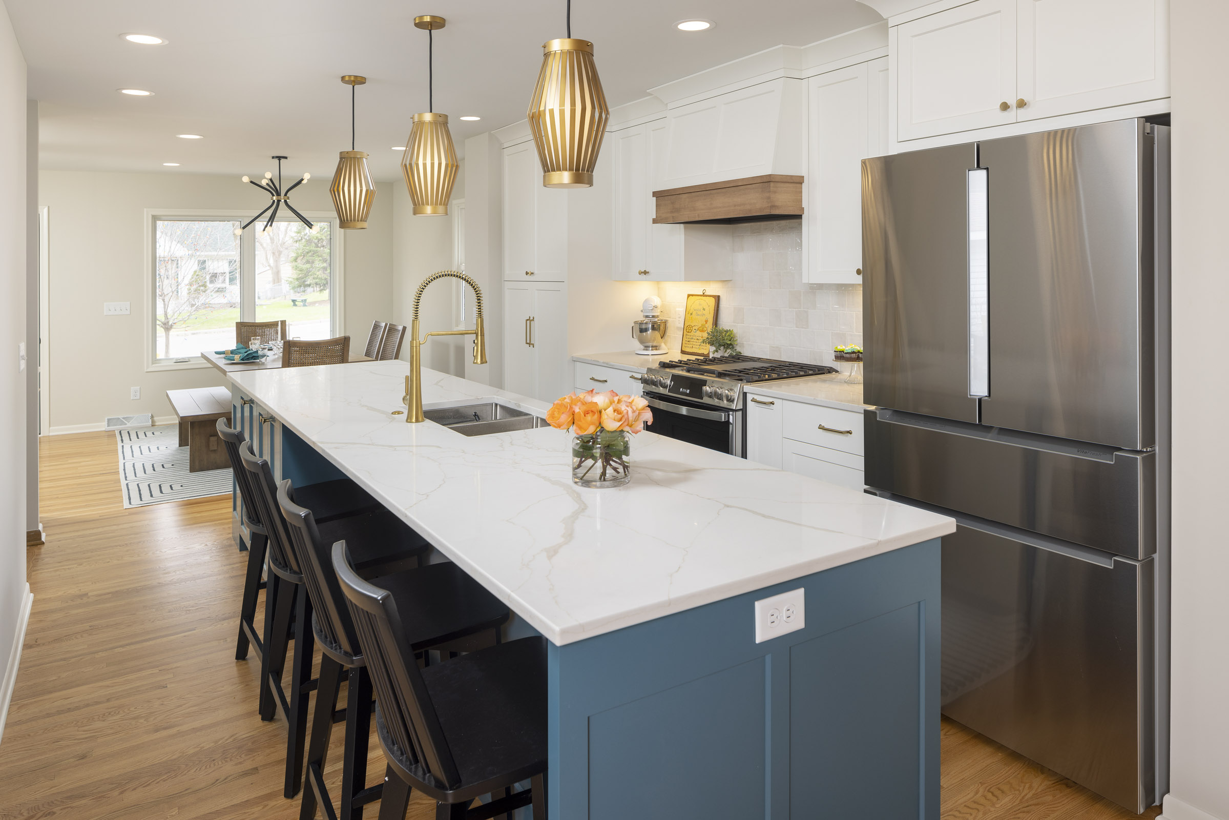 Our Richfield homeowners are delighted with their remodeled home where the kitchen island is in the center of all the action between the family room and dining areas. Outside a new covered front landing, siding and roofing add to the stunning appeal.