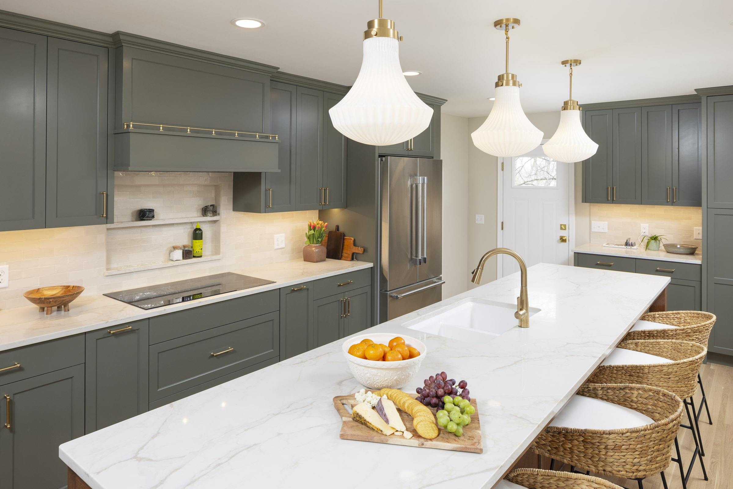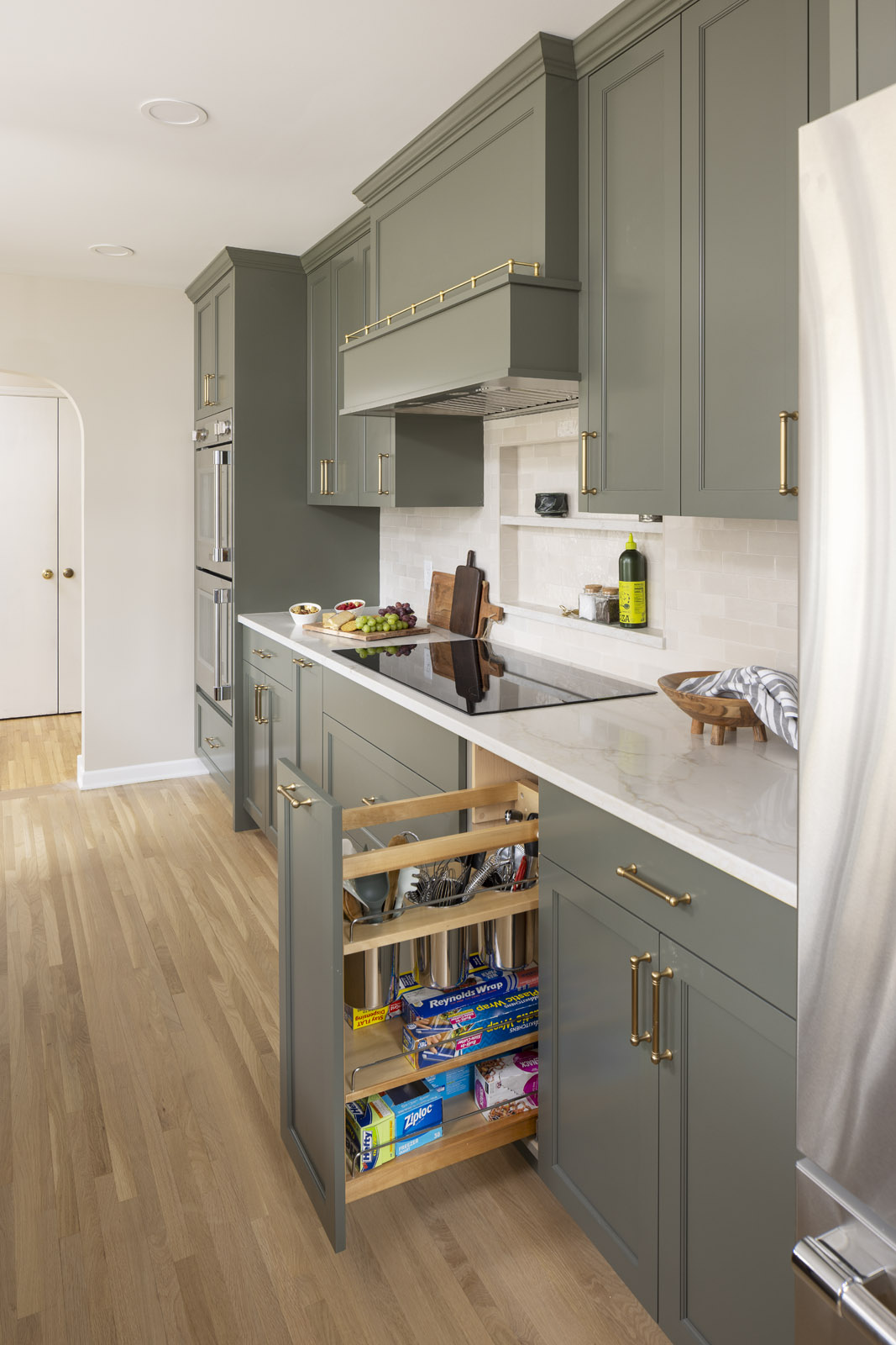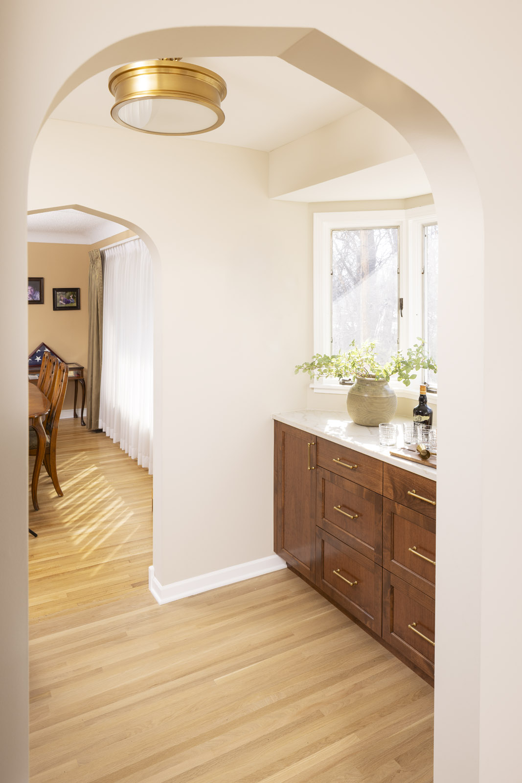 While keeping classic arched doorways, this expanded kitchen remodel offers island seating, prime organization, and open layout for joyful entertaining.